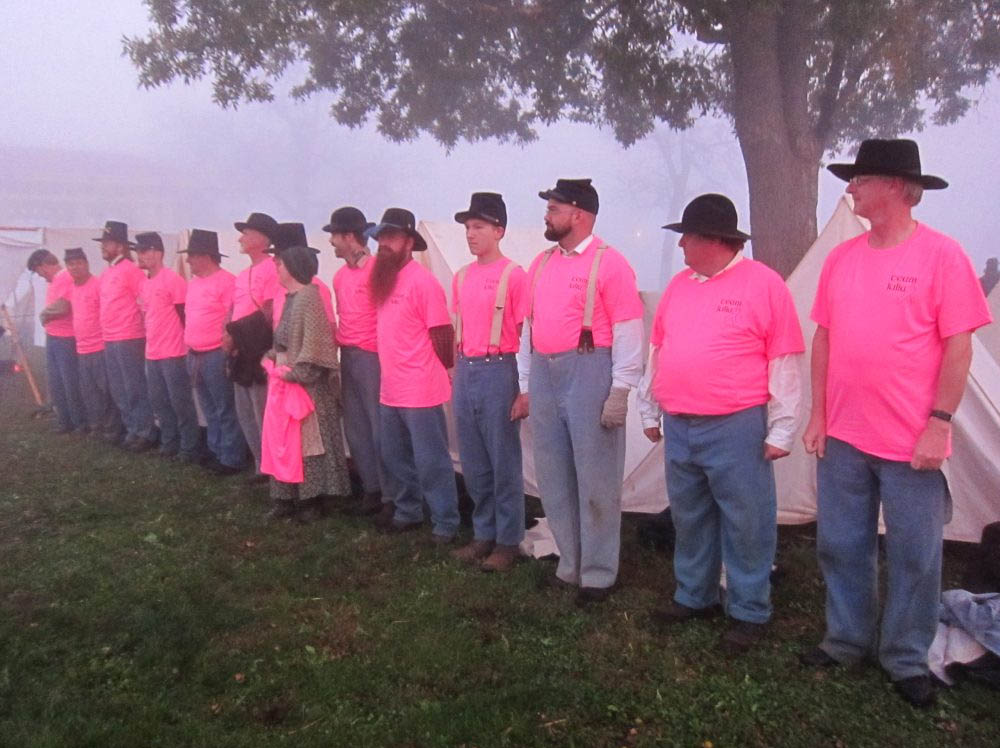 During the time of my surgeries, I still went camping with the Civil War group I belong to. I didn’t do as much when I was there, but I still showed up. One person asked me why I was there instead of home and I answered simply, “I could be home and miserable, or I can be out with my friends where I would be distracted from my discomfort.” When we were at an event, two weeks after my mastectomy, the unit surprised me with the Pink T-Shirt Brigade. That is true love and support right there.